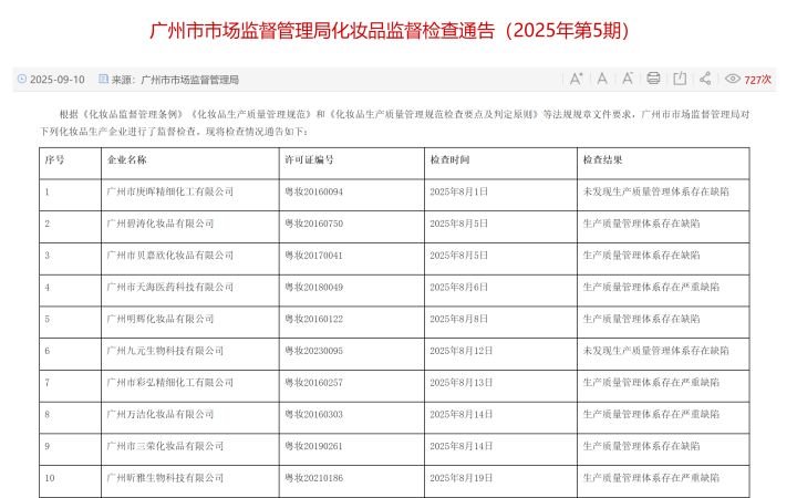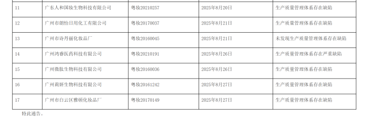 检查通告显示,17家化妆品企业中,有5家企业生产质量管理体系存在严重缺陷,包括广州市天海医药科技有限公司、广州市彩弘精细化工有限公司等。有9家生产质量管理体系存在缺陷,包括广州碧涛化妆品有限公司、广东人和国妆生物科技有限公司、广州市三荣化妆品有限公司、广州微肽生物科技有限公司等。